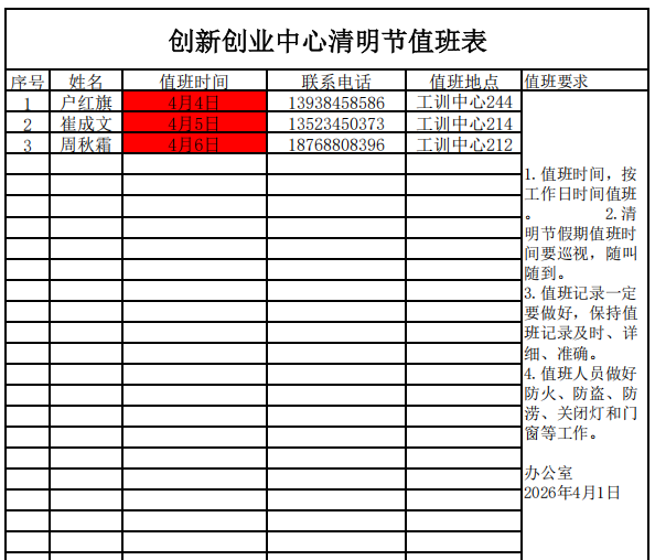 创新创业中心清明节值班表